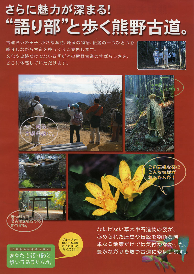 熊野本宮語り部の会では語り部と歩く熊野古道を行っております。なにげない草木や石造物の姿が、秘められた歴史や伝説を物語るとき単なる散策だけでは気付かなかった、豊かな彩りを放つ古道に変身します。