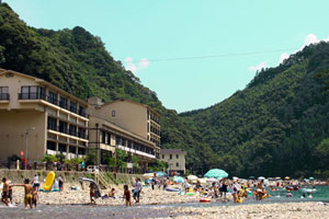毎年ゴールデンウィークの前後から河原で泳ぐ方が増えてきます。冨士屋前の大塔川(おおとうがわ)はあまり深くなく泳ぐことができます。