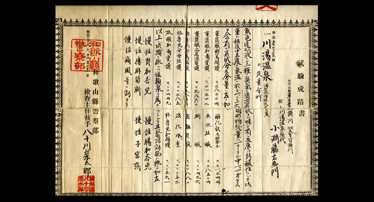 明治36年の温泉分析表が出てきました。昔は警察が温泉分析していたことがわかります。ロビーの展示ケースに展示しております。
